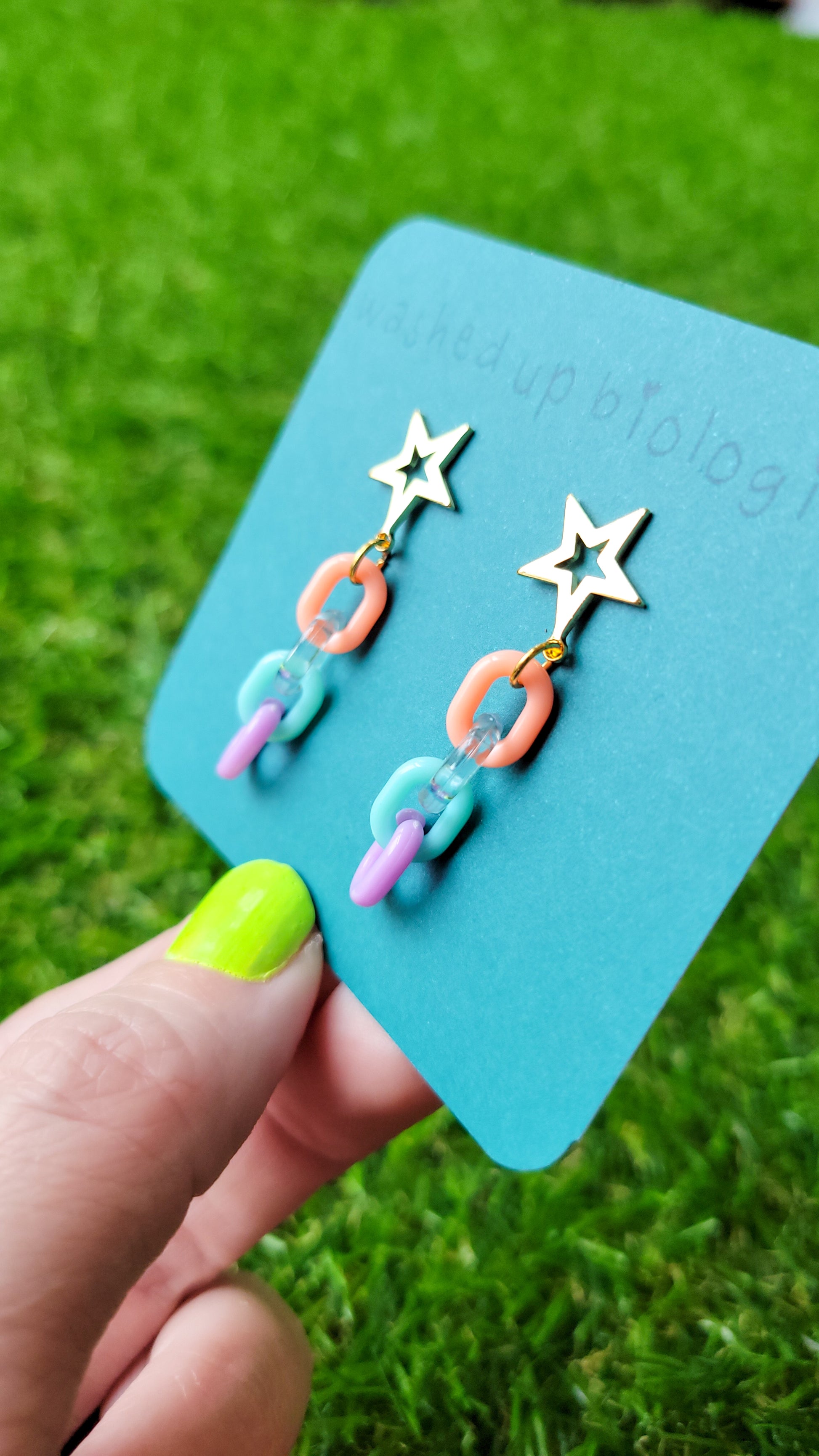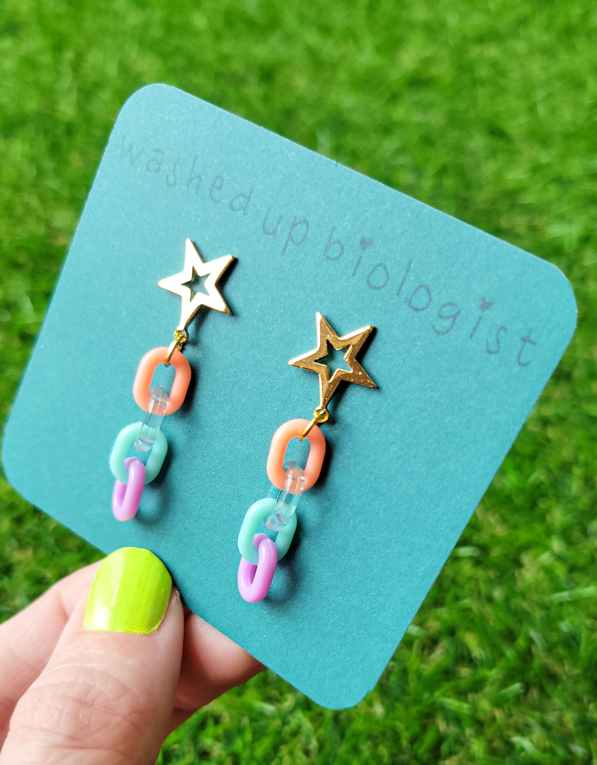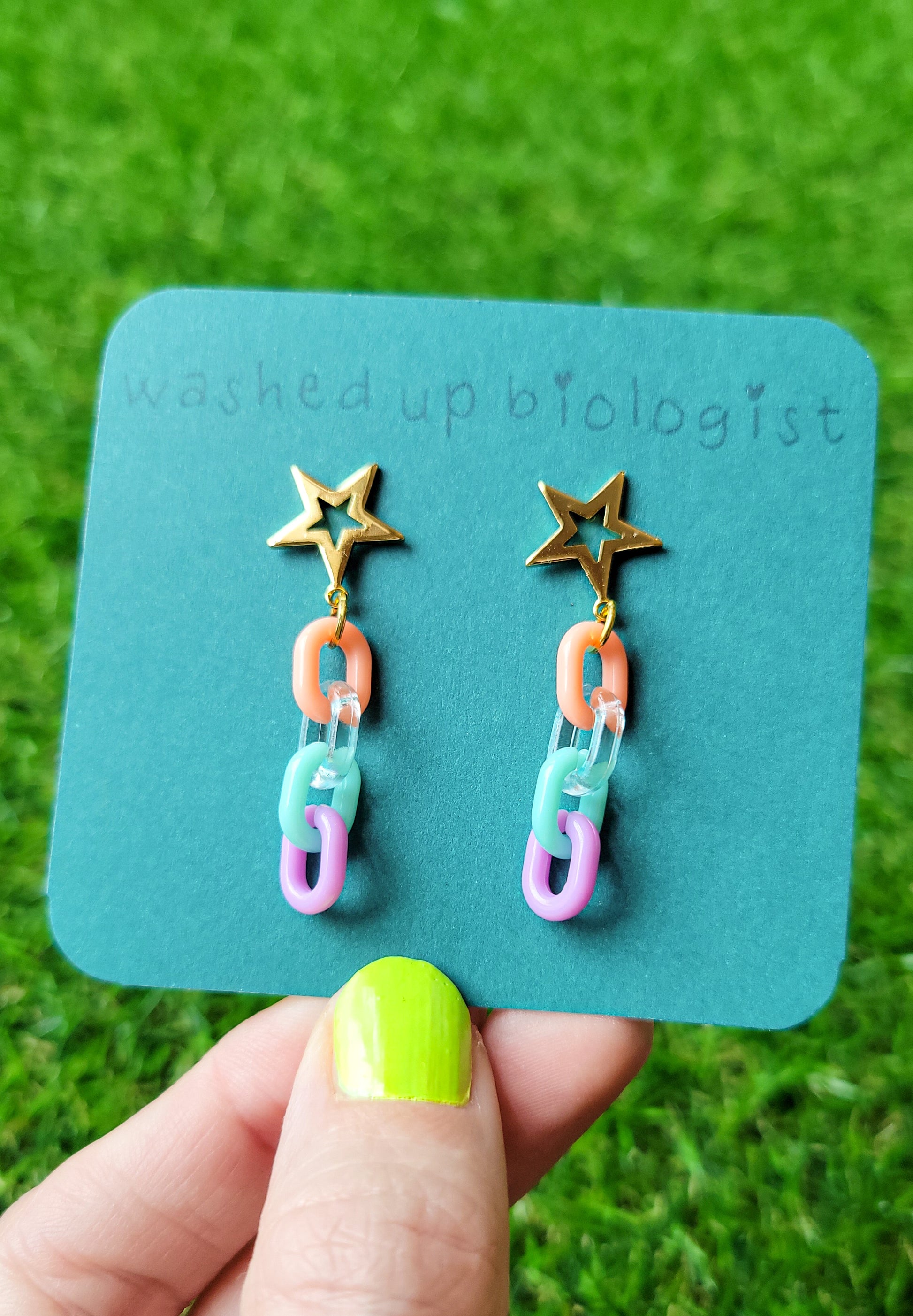 18k gold plated star earring studs with multicolored plastic chain connectors